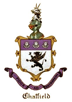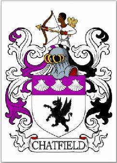 Crest - An Antelope's Head erased argent (silver): Horned and Ducally Gorged gules (red) {Others state it should be or (gold)}. Arms - A Griffin (or Gryphon) segreant (rampant) sinistra (on the left hand) argent: on a chief purpure (purple): Three Escallop Shells of the field. Motto - "Che Sara Sara" (What will be, will be). The Escallop Shells were the Pilgrims sign in their expeditions to Holy Places (Holy Wars) and became such distinguished insignia that Pope Alexander IV, allowed it to none but those who were truly Noble and were afterwards put into the Collar of the Order of St. Michael and introduced into Armoury. It is also said that Escallop shells were the symbol of St. James and were adopted by people who went on a pilgrimage to Compostella in Spain and were then adopted by all pilgrims, even those who went to Canterbury. The Griffin (or Gryphon) is a chimerical creature half an eagle and half a lion. It is said that when he attains his full growth he will never be taken alive. Hence he is a fit representative of a Valiant Hero, who rather than yield to his enemy, exposes himself to the worst of dangers. It is one of the Principal Bearings in Heraldry. The Chatfield Arms are of Ancient Record and it is very probable that the incorporation of Arabesque design around the Shield was granted by some Royal Chief for Services of Distinction.