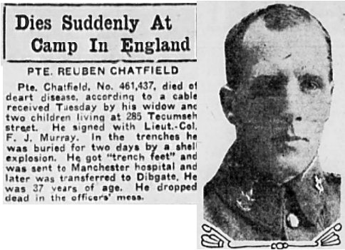 Northamptonshire, England. Chatfield, Private John William 10139 15341778. b. unknown d. Sep. 25, 1915 Loos Memorial, Loos-en-Gohelle, Nord-Pas-de-Calais, France. 8th (Service) Battalion Devonshire Regiment. Son of Arthur and Matilda Chatfield of 1 Shelton Place, Heavitree, Exeter, Devon, England. Husband of Caroline Alberta Chatfield nee Taylor of 8 Cumberland Terrace, Paris Street, Exeter, Devon, England. (Ive seen a long list of men from Paris Street that were killed). Married Exeter 3rd Qtr 1905. Possibly has a son, John William, born 2nd Qtr 1907 in Exeter (died Oct 1994 in Exeter). Born Abt 1887 Manchester, England (There is a John William Chatfield born in Salford 3rd Qtr 1886). Enlisted in Cardiff, South Wales. Battalion landed at Le Havre 26 Jul 1915. Killed in Action 25 Sep 1915 (first day of the Battle of Loos) aged 28. Loos Memorial Panel 35 to 37. Chatfield, Sergeant Joseph 10/1773 56439995. b. 1887 d. Jul. 20, 1918 Foncquevillers Military (..., Foncquevillers, Nord-Pas-de-Calais Region, France. 1st Battalion Wellington Infantry Regiment, New Zealand Expeditionary Force. Son of William George and Mary Chatfield, Barrys Bay, Canterbury, New Zealand. Died of wounds received 20 Jul 1918. Buried Foncquevillers Military Cemetery, France. Grave reference II.E.6