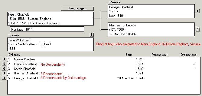 (http://www.theclergydatabase.org.uk) Chart of Chatfield boys emigrating to New World from Pagham Sussex, 1639