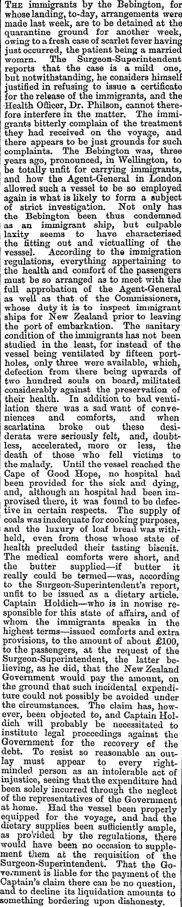 Second of two articles from the New Zealand Herald, 15 August 1876 about the arrival of "The Bebington" in Auckland.