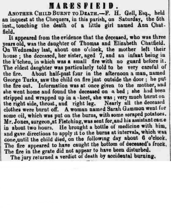 Ann burrnt to death when her dress caught fire. Her mother Elizabeth had left her in the charge of Eliza Ann (7).