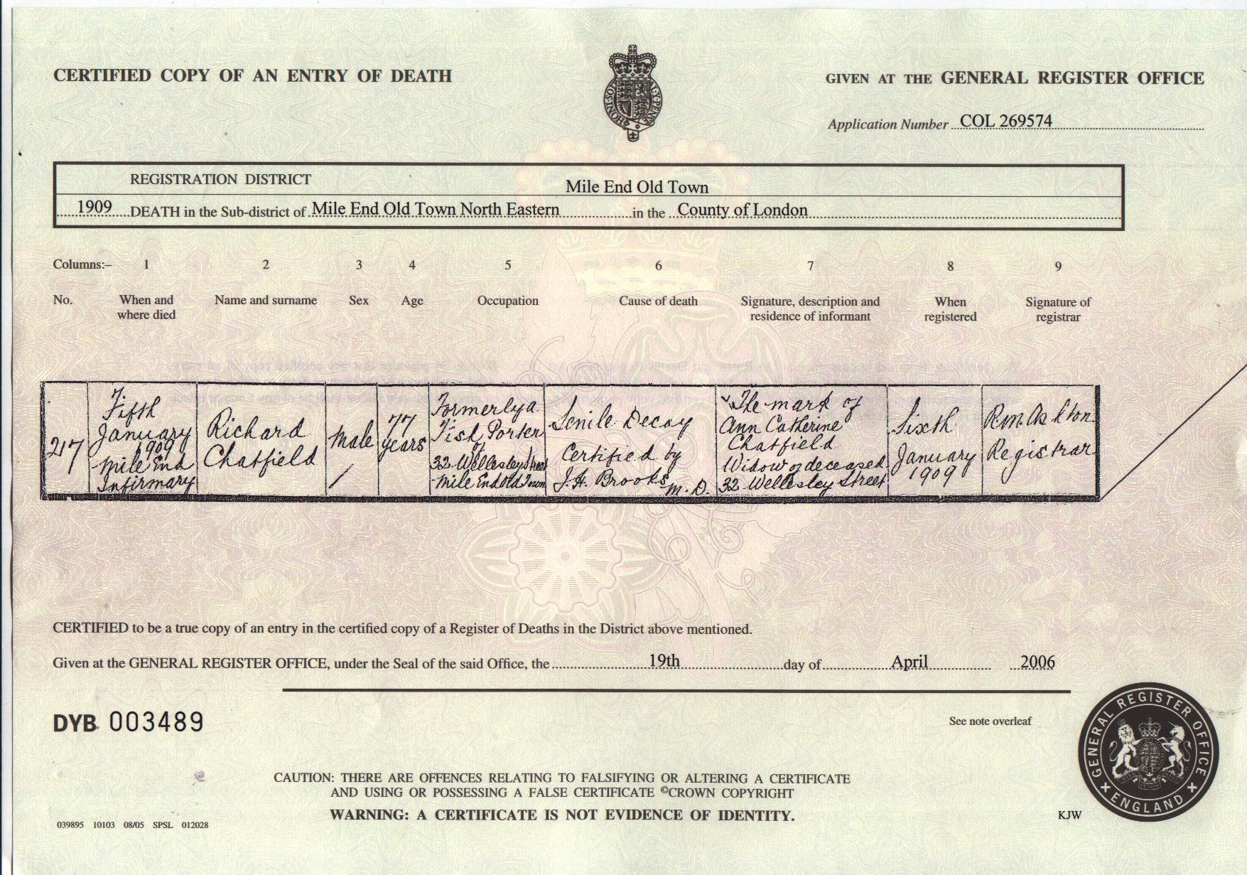 Richard CHATFIELD 1831-1909 Death Certificate