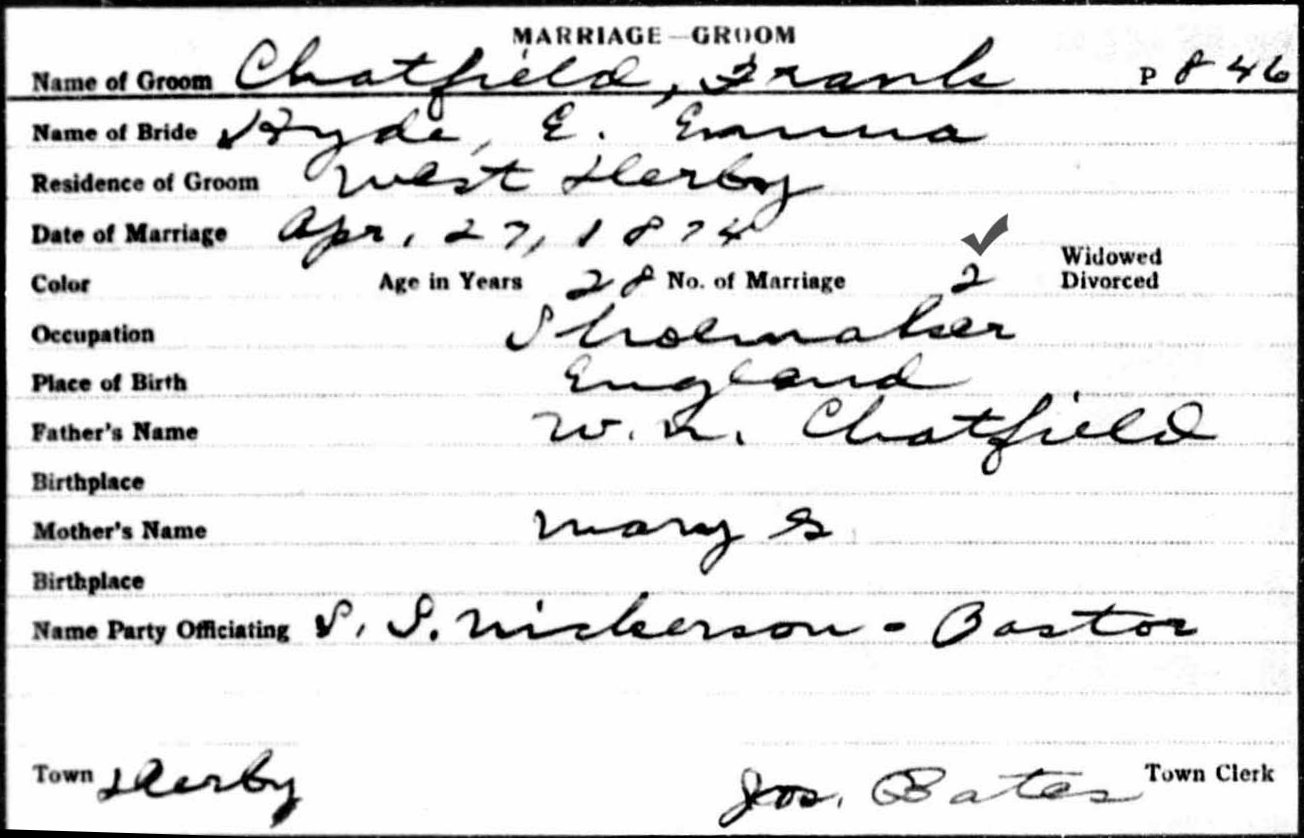 Frank CHATFIELD - E Emma Hyde marriage 1874