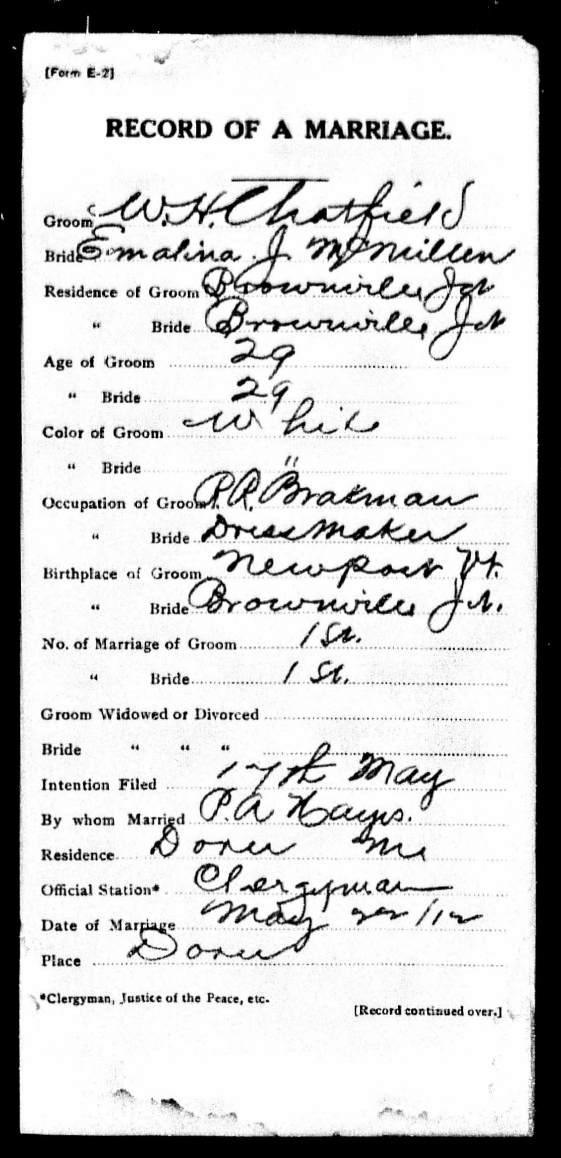William H CHATFIELD - Emeline J McMillen marriage 1912