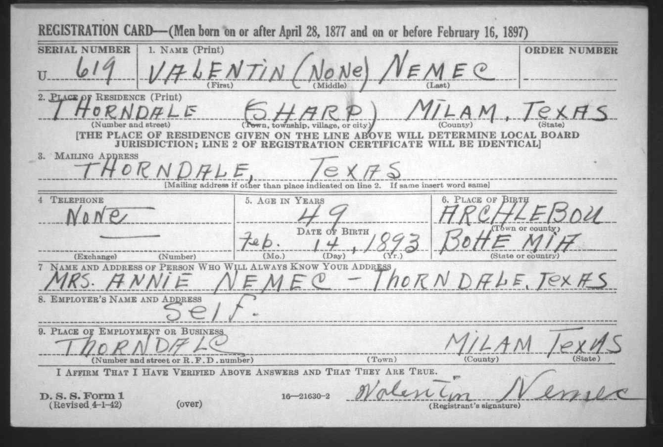 Valentin Nemec 1893-1972. WWI Registration Card.