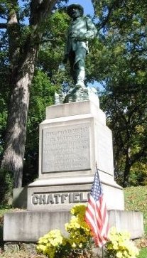 The statue, in Riverside Cemetery, Waterbury, CT. USA, gazes in the direction of the monument "Dedicated to the Memory of the Unknown Dead". Gravestones bearing initials of other members of the Chatfield family surround the monument.