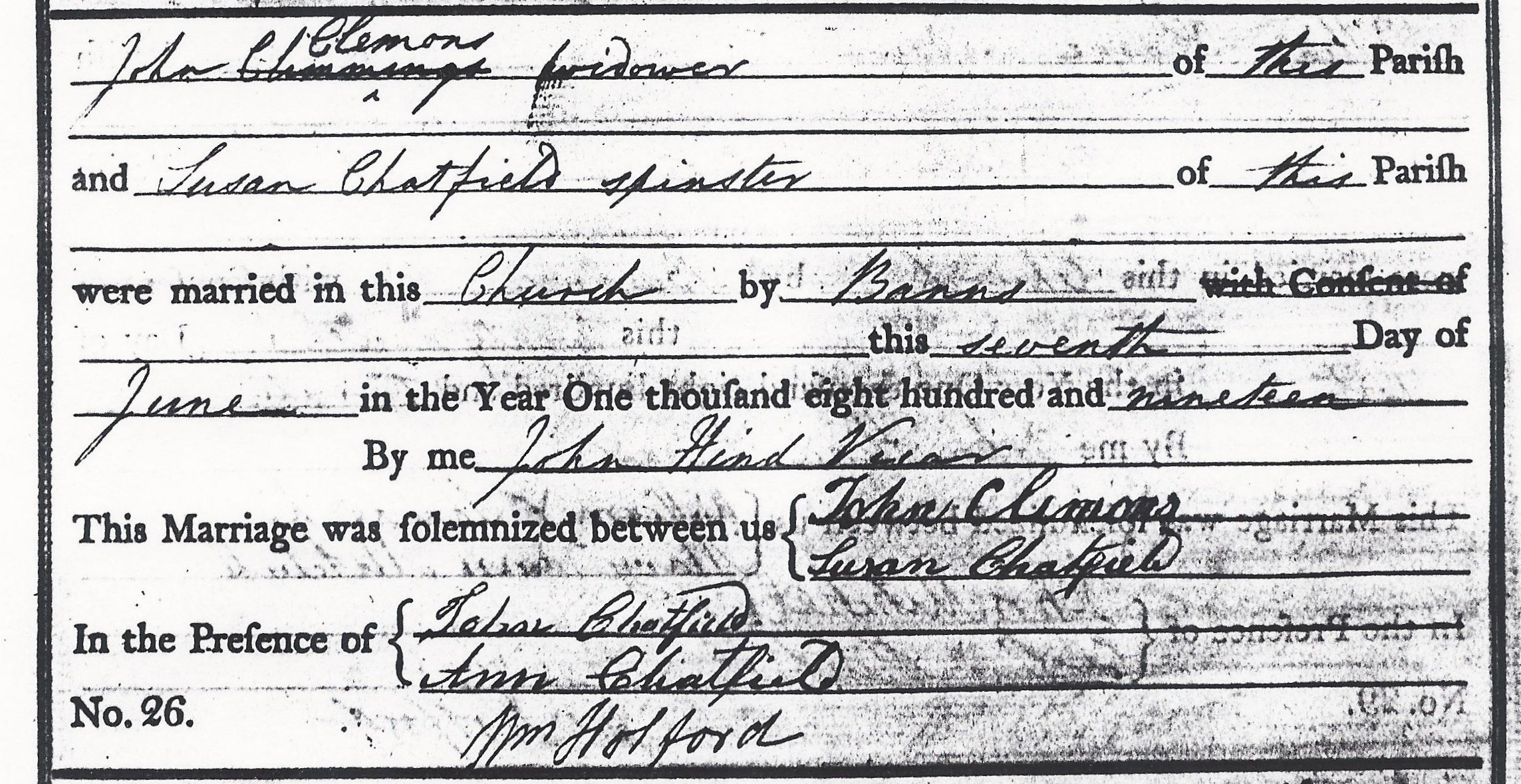 Marriage Certificate Chatfield Susan - Clemons John 1819