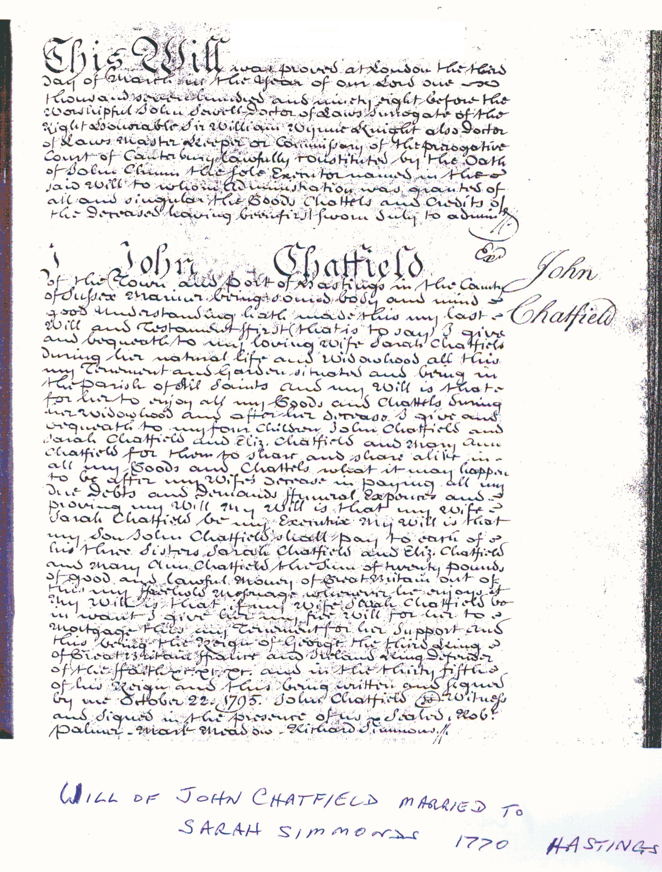 John Chatfield born abt 1739 - died1770 Will
