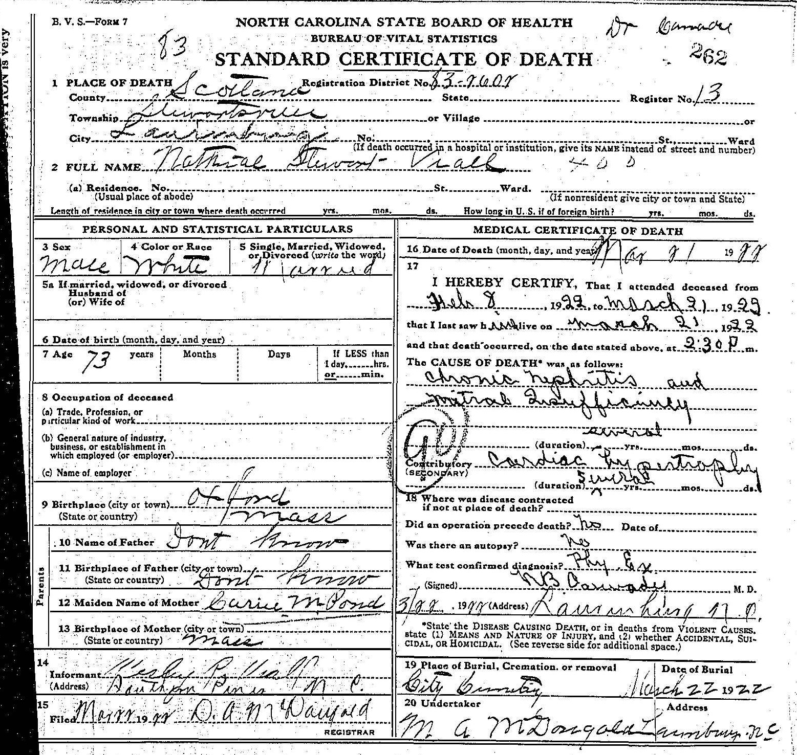Nathanial Stewart VIALL 1848-1922 Death Cert