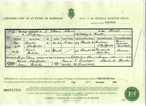 Marriage Harold CHATFIELD 1896-1958 certificate
