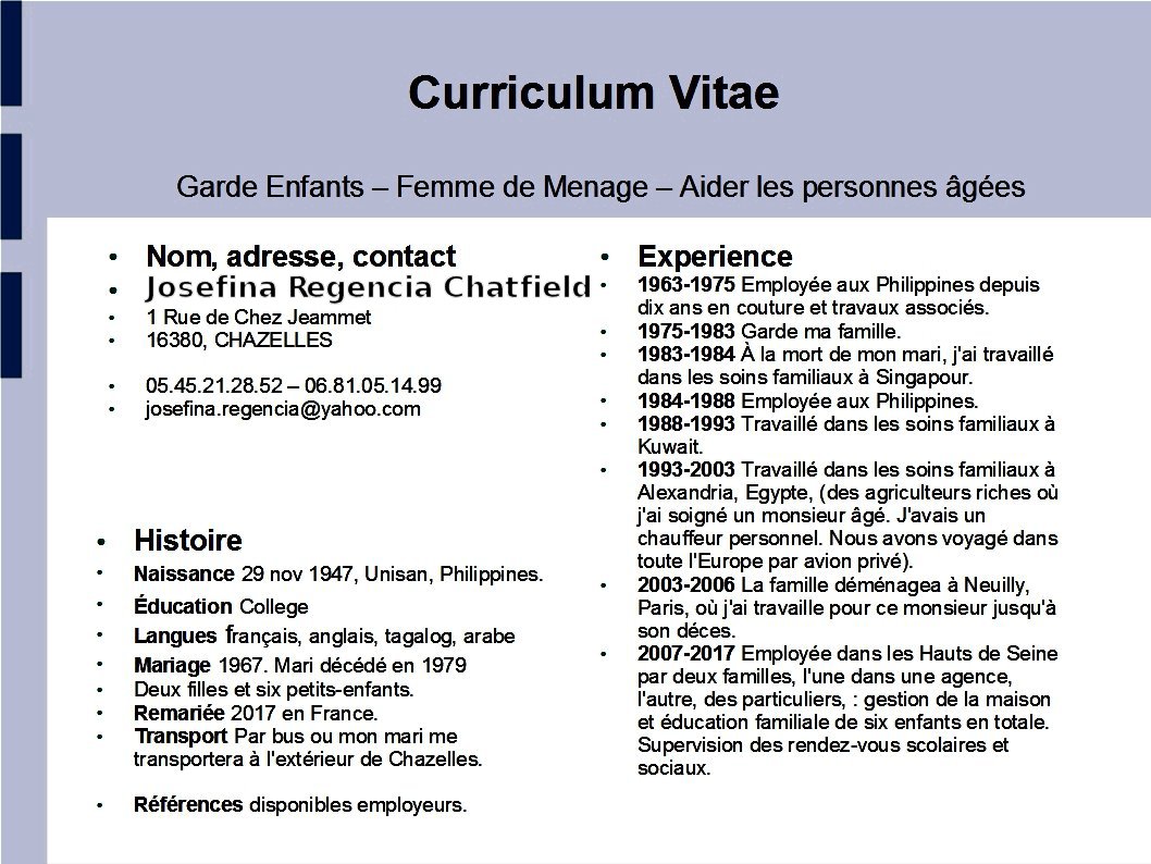 Vingt ans plus d'experience avec familles de culture et substance en les Philippines, Egypte, Kuwait, Singapour, Paris, etc.- - -Twenty years plus experience with families of culture and substance in the Philippines, Egypt, Kuwait, Singapore, Paris, etc. |